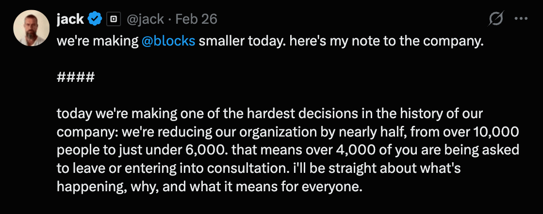 Translation: Block didn't lay off 4,000 people because of AI. It laid off 4,000 people because AI made it possible to justify it. That's the new normal.